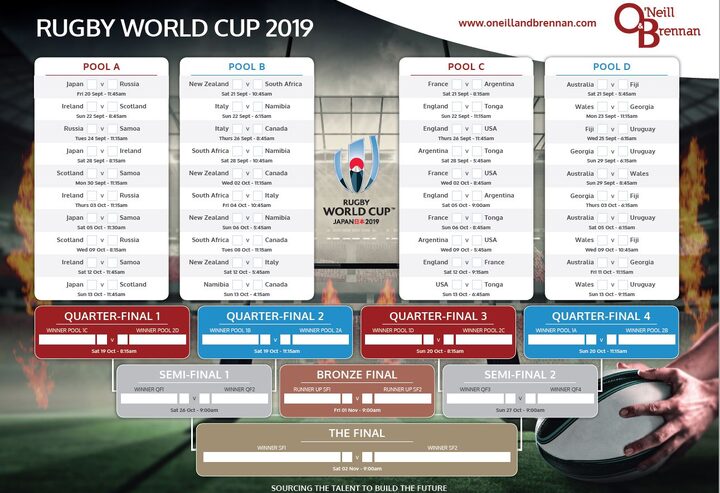 O’Neill & Brennan’s Rugby World Cup 2019 wall planner is now available for all to download, ensuring you don’t miss out on any of the action and talent on display this September.
