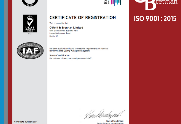 O'Neill & Brennan Ireland achieve ISO 9001:2015 certification
