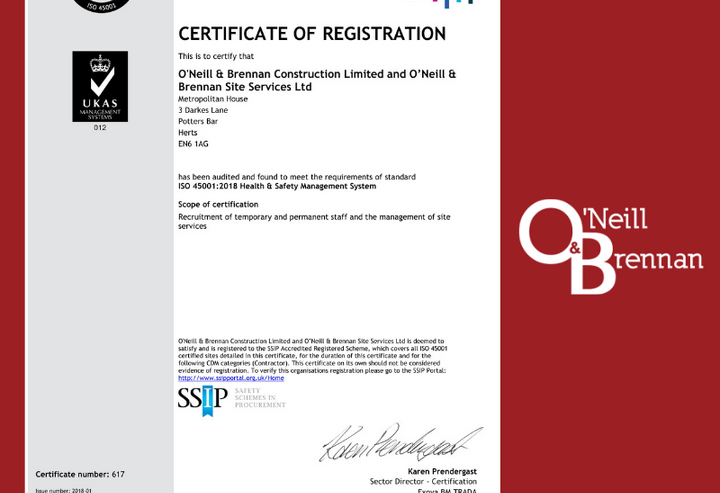 O’Neill & Brennan Construction Limited and O’Neill & Brennan Site Services Ltd are pleased to announce they have attained the ISO 45001 certification.