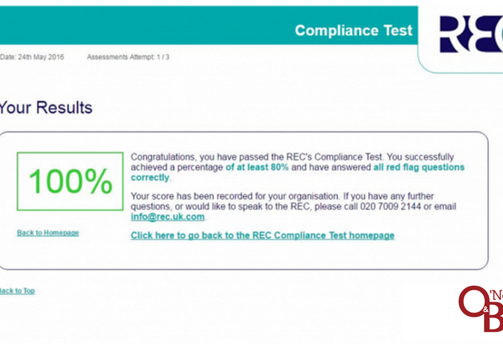 O’Neill & Brennan achieve 100% in REC Compliance Test O’Neill & Brennan have passed the Recruitment & Employment Confederation’s compliance test, meaning we reach standards of professionalism and ethical practice set out in the REC code of conduct. The test must be